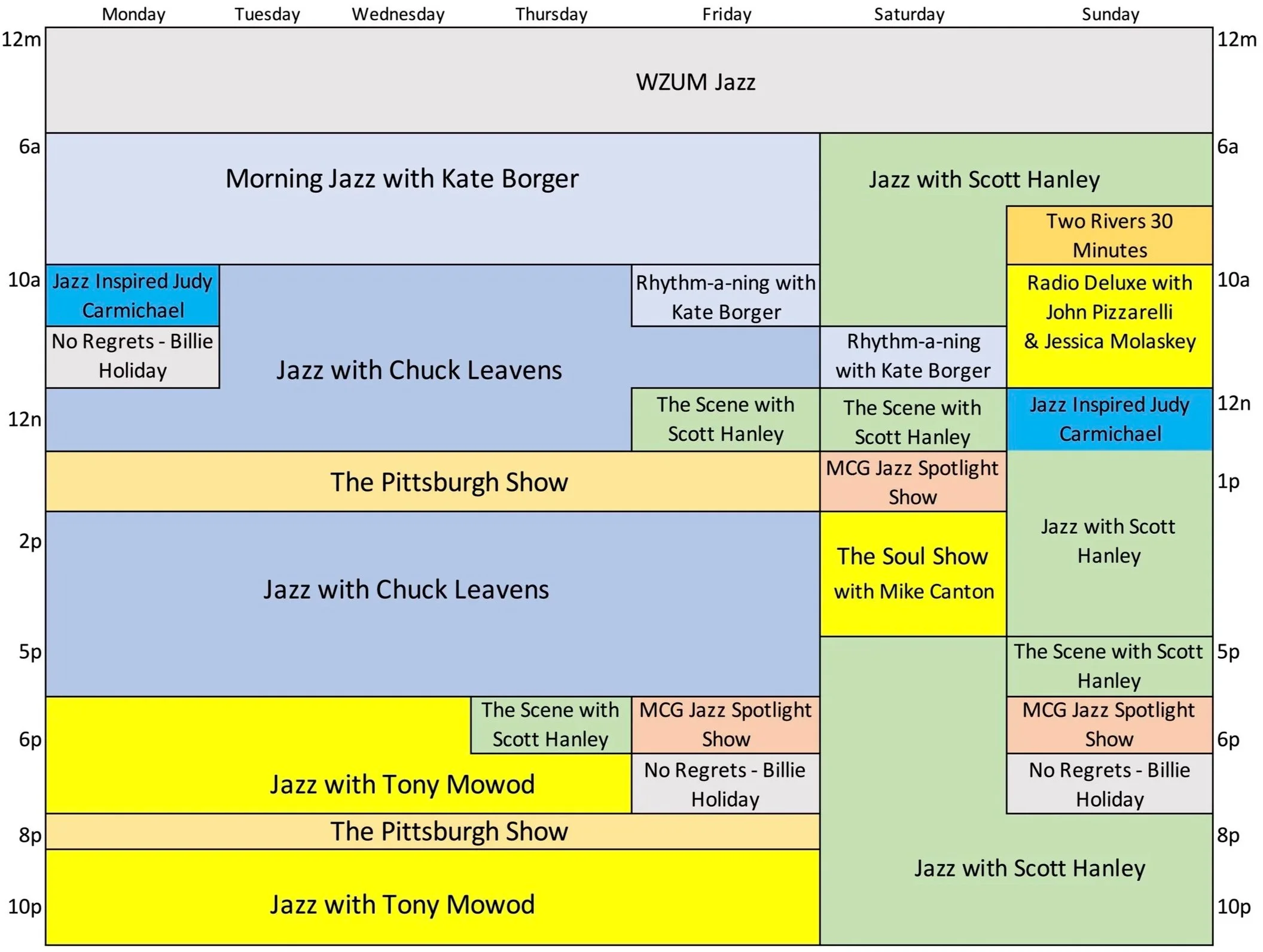 WZUM is a radio and online catalyst for renewed interest and exposure to this great music. That includes the Jazz Central calendar, plus programs like The Scene, the Pittsburgh Show, the MCG Jazz Spotlight, Rhythm-a-Ning and the Soul Show with Michael Canton.