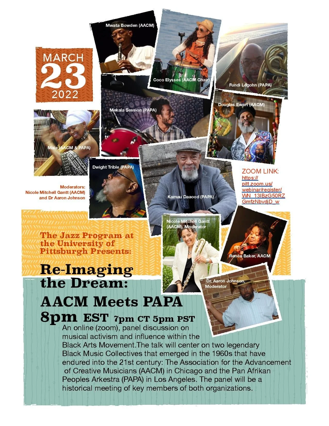 Re-Imaging the Dream" event this Wednesday, March 23rd, 8:00pm EST with members from the Association for the Advancement of Creative Musicans (AACM) and the Pan Afrikan Peoples Arkestra (PAPA). Registration link the Pitt Jazz website, jazz.pitt.edu