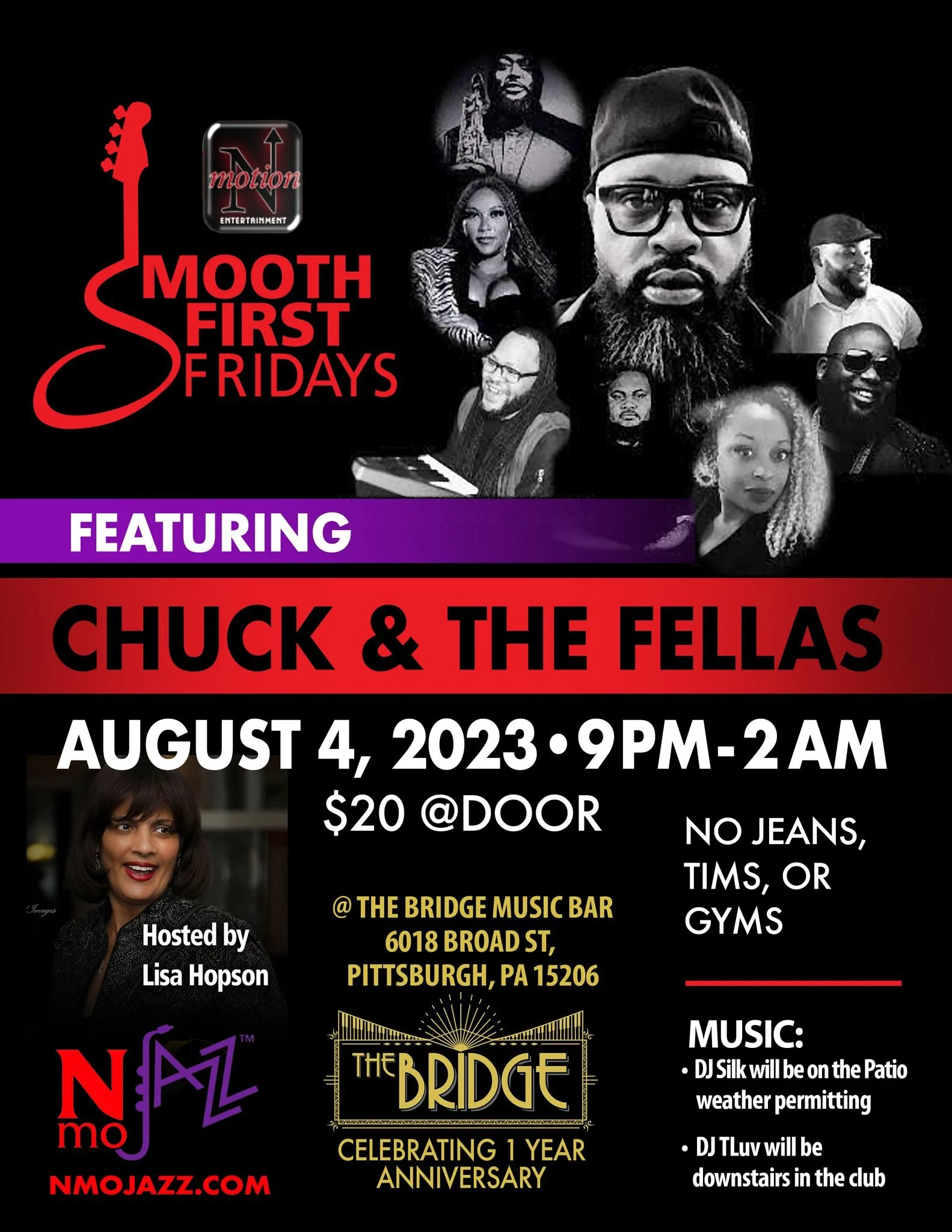 Smooth First Fridays - Bridge Music Restaurant and Bar, East Liberty Friday, August 4, 2023 9:00 PM 21:00 Saturday, August 5, 2023 1:00 AM 01:00 The Bridge Restaurant & Bar 6018 Broad Street Pittsburgh, PA, 15206 United States (map) Google Calendar ICS Smooth First Friday - Bridge Music Restaurant and Bar, East Liberty Featuring Chuck and the Fellas
