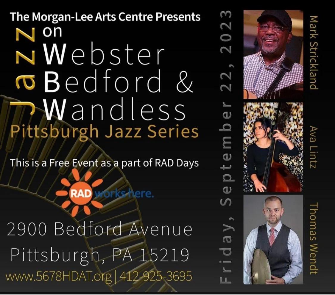 The Morgan-Lee Arts Centre will kick off the Jazz on Webster, Bedford & Wandless Jazz Series in the Historic Hill District on September 22, 2023. Jazz provided by Thomas Wendt, Mark Strickland, and Ava Lintz, outdoors in their spacious parking lot. This event is free as a part of the Regional Asset District RAD Days.