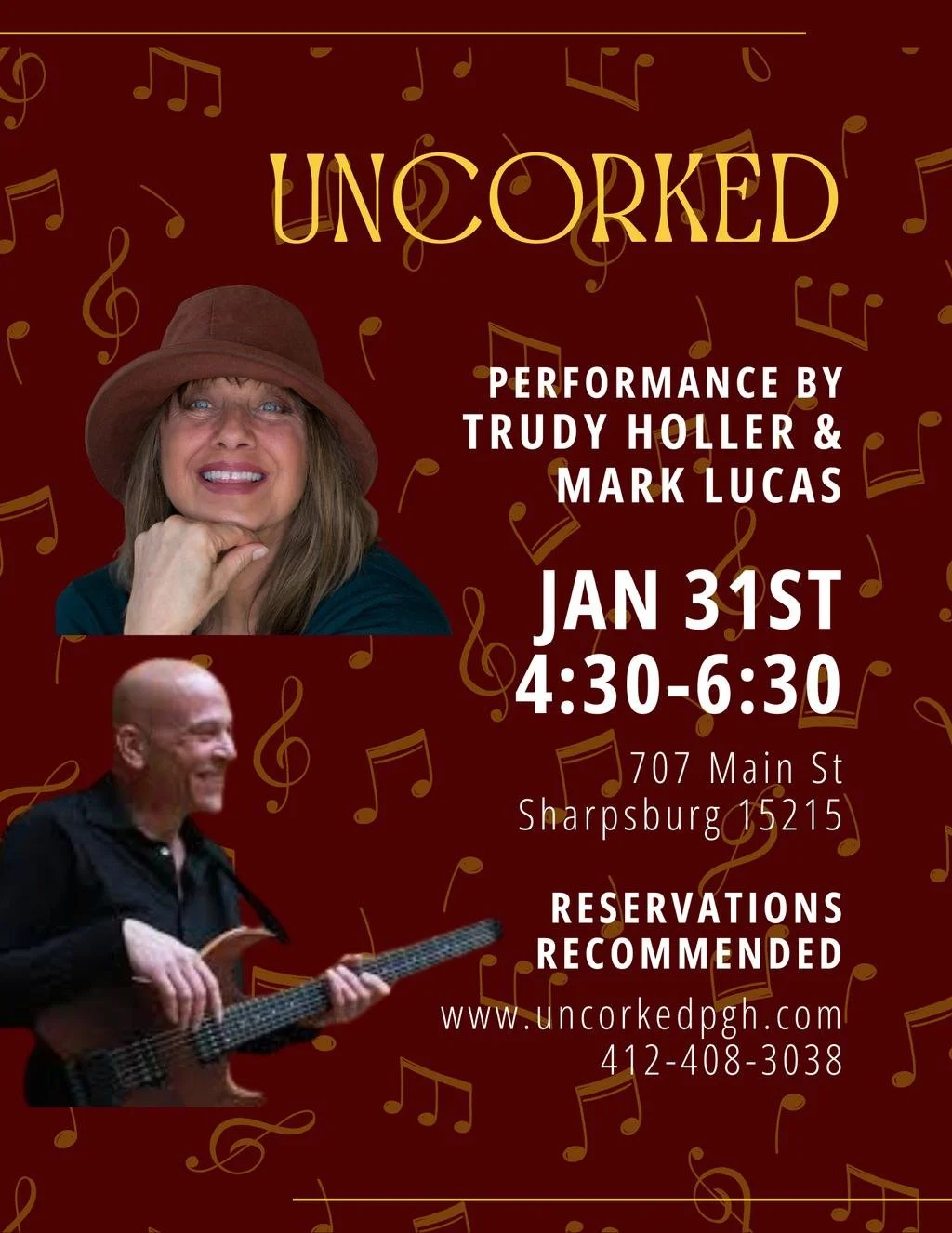 Trudy Holler and Mark Lucas - Uncorked Jazz Club, Sharpsburg Saturday, January 31, 2026 4:30 PM 6:30 PM 16:30 18:30 Uncorked Jazz Club 703 Main Street Pittsburgh, PA, 15215 United States (map) Google Calendar ICS Trudy Holler and Mark Lucas - Uncorked Jazz Club, Sharpsburg Trudy Holler - vocals; Mark Lucas - guitar