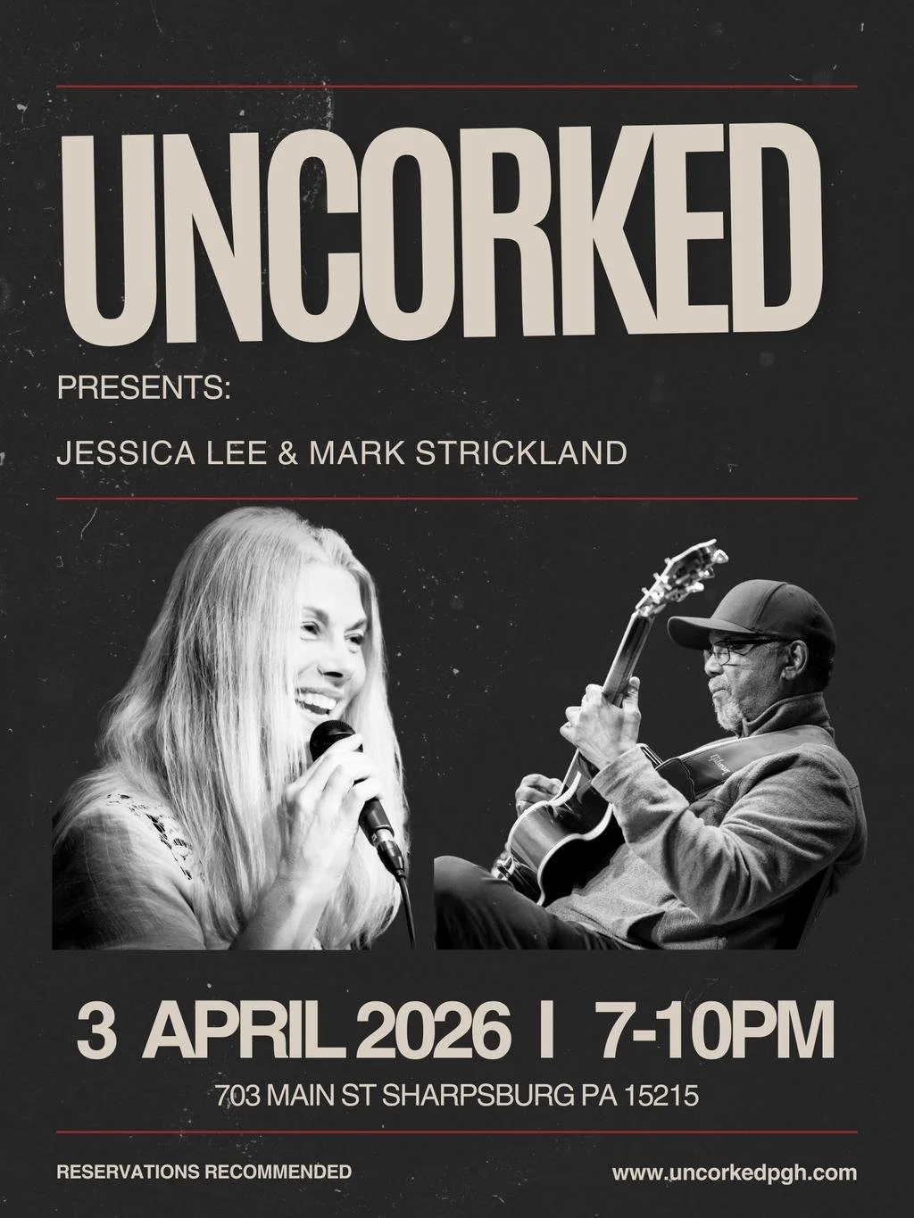 Jessica Lee and Mark Strickland - Uncorked Jazz Club, Sharpsburg Friday, April 3, 2026 7:00 PM 10:00 PM 19:00 22:00 Uncorked Jazz Club 703 Main Street Pittsburgh, PA, 15215 United States (map) Google Calendar ICS Jessica Lee and Mark Strickland - Uncorked Jazz Club, SharpsburgJessica Lee - vocals; Mark Strickland - guitar