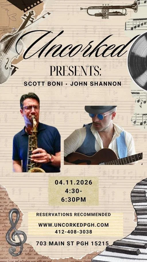 Scott Boni and John Shannon - Uncorked Jazz Club, Sharpsburg Saturday, April 11, 2026 4:30 PM 6:30 PM 16:30 18:30 Uncorked Jazz Club 703 Main Street Pittsburgh, PA, 15215 United States (map) Google Calendar ICS Scott Boni and John Shannon - Uncorked Jazz Club, Sharpsburg Scott Boni - sax; John Shannon - guitar