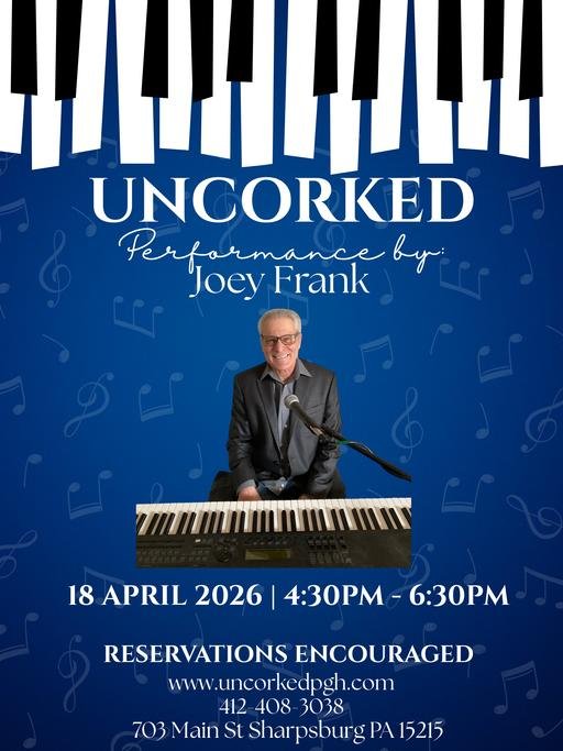 Joey Frank - Uncorked Jazz Club, Sharpsburg Saturday, April 18, 2026 4:30 PM 6:30 PM 16:30 18:30 Uncorked Jazz Club 703 Main Street Pittsburgh, PA, 15215 United States (map) Google Calendar ICS Joey Frank - Uncorked Jazz Club, Sharpsburg Joey Frank - keys